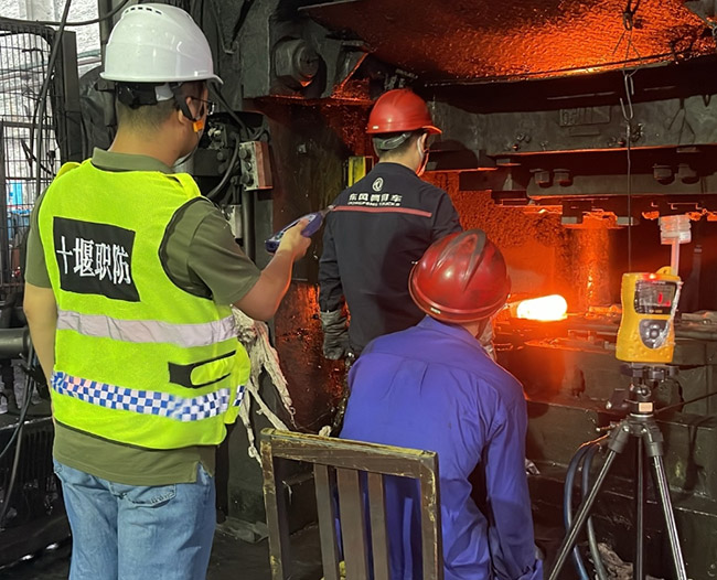 在高温高湿的极端天气条件下,室外热浪翻涌,车间内更是闷热难耐。但十堰市职业病防治院的职业卫生检测人员依然步履不停,对企业车间内的粉尘、噪声、化学毒物等职业危害因素展开全面检测。在锻造车间,为了检测到锻造工人接触噪声的真实情况,检测人员顶着震耳欲聋的噪声,紧贴表面温度高达60℃的主机旁架设仪器。周围的空气在热浪中扭曲,灼热的气浪裹挟着金属粉尘扑面而来,沉重的锻造震感冲击着内脏,然而这些都无法撼动检测人员对数据真实的追求。