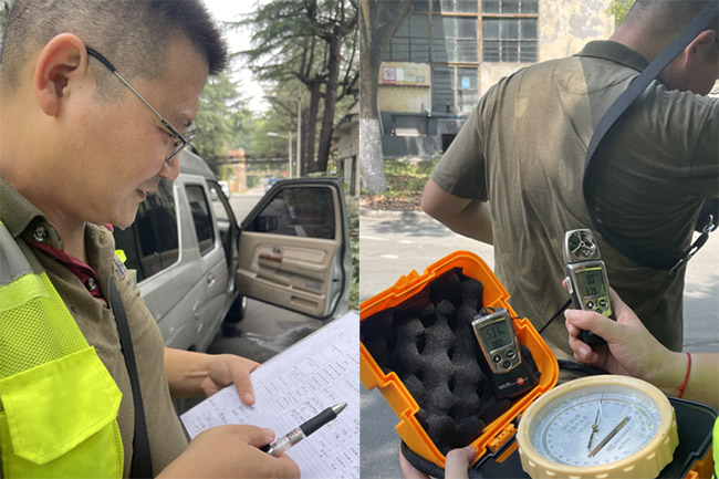 在焊接工位密集的厂房,检测人员穿梭于飞溅的火花与燥热的电焊烟尘中,但他们的操作仍然如往常一样稳定如一,反复确认每个应测的点位没有遗漏;他们手持采样设备,在轰鸣的机器间穿梭,严格按照规范布设采样点——离尘源的距离、工人的操作位、呼吸带的高度……每一个细节都反复核对,绝不因高温而简化流程。